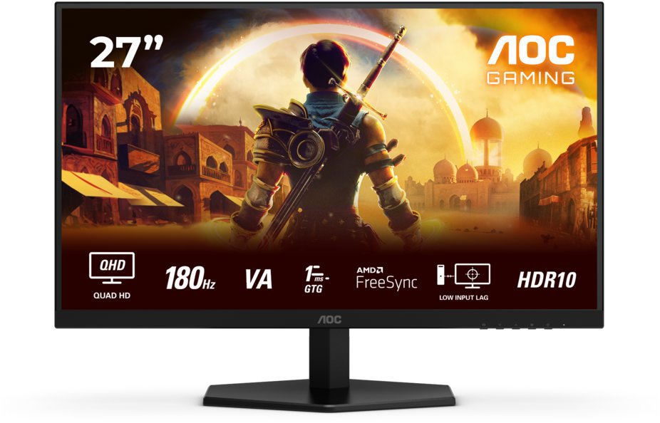 Monitor – VA, Quad HD 2560 × 1440 (16 : 9), 180 Hz, antireflexný displej, 8 bit, 0,1 ms, FreeSync a Adaptive-Sync, HDMI a DisplayPort, VESA Užite si hranie svojich obľúbených hier s 27″ LCD monitorom AOC s kvalitným Quad HD (2560 × 1440) rozlíšením. Plynulý obraz vám ponúkne VA panel s obnovovacou frekvenciou až 180 Hz a dobou odozvy 0,1