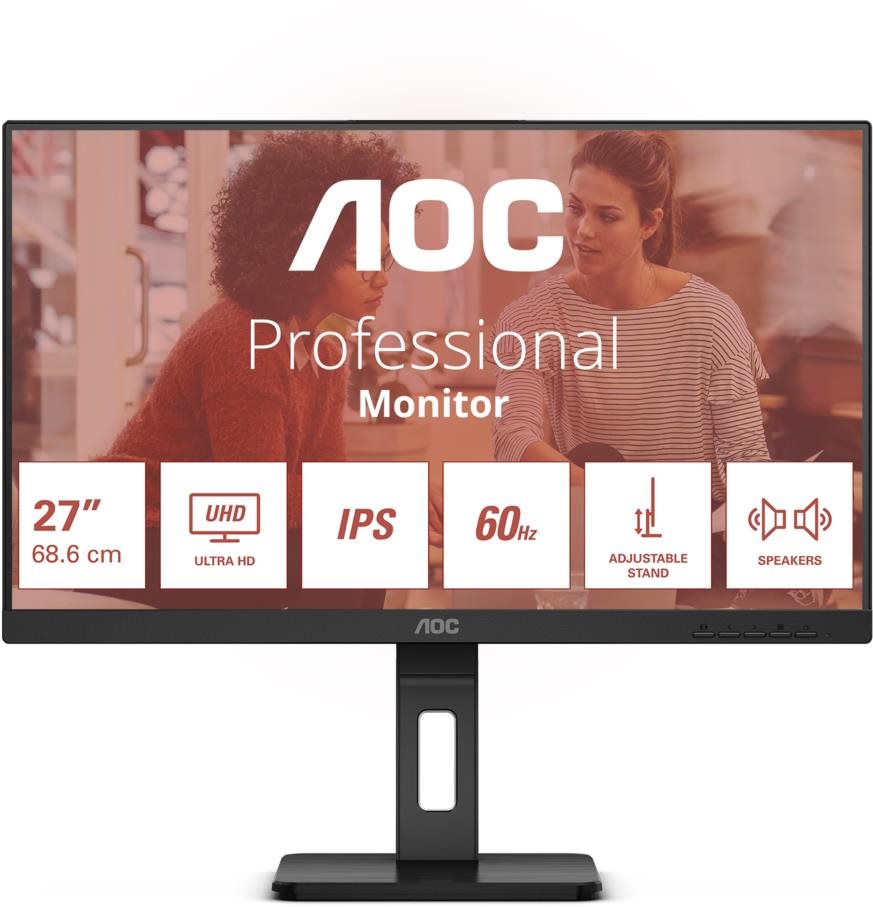 Monitor – IPS, 4K 3840 × 2160 (16 : 9), 60 Hz, antireflexný displej, 10 bit, 4 ms, FreeSync, nastaviteľná výška, pivot, reproduktory, HDMI a DisplayPort, USB dátové rozhranie, VESA Tento LCD monitor AOC s uhlopriečkou 27″ zvláda prácu v 4K (3840 × 2160) rozlíšení, ktoré ponúka detailné zobrazenie, ideálne na prácu s vizuálne náročným obsahom. Vykreslenie v 4K podporujú počítače