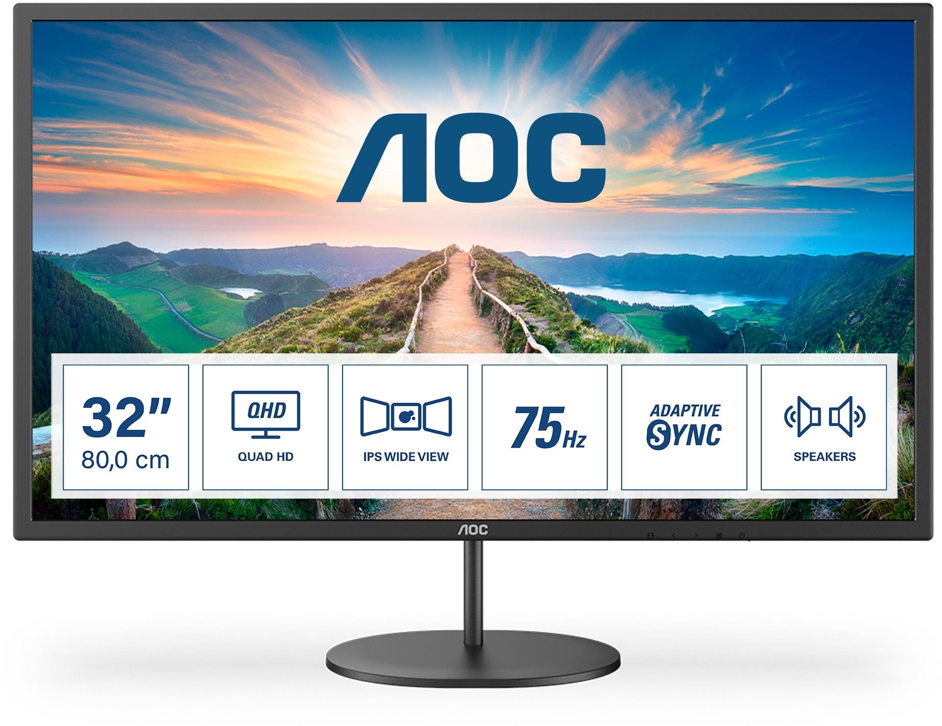 Monitor – IPS, Quad HD 2560 × 1440 (16 : 9), 75 Hz, antireflexný displej, 8 bit, 4 ms, G-Sync kompatibilný, reproduktory, HDMI a DisplayPort, VESA Kvalitný kancelársky monitor AOC Q32V4 s IPS panelom a QHD rozlíšenímAk každý deň pracujete dlhé hodiny na počítači, tak kvalitný displej by mal byť jasným základom vašej výbavy. Moderne vybavený kanc
