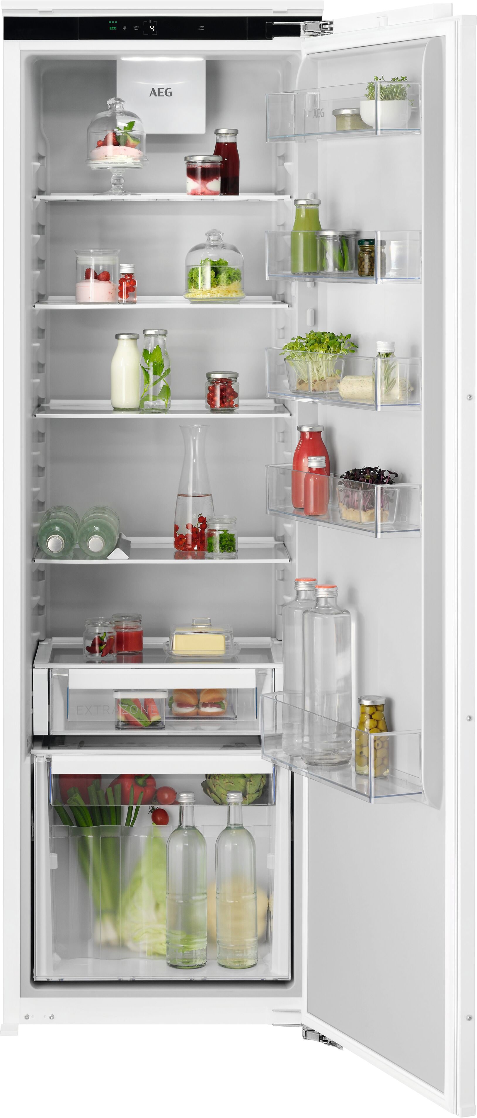 Vstavaná chladnička – bez mrazničky, energetická trieda E, objem chladničky 310 l, doprava, 5 políc, 1 chladiaci okruh, LED osvetlenie, rozmery 176,9 × 55,7 × 54,9 cm (V׊×H), čelný dekoratívny panel na dvierkach nie je súčasťou dodávky Perfektne čerstvé potravinyVstavaná chladnička AEG 6000 DynamicAir TK6DS181ECVstavaná chladnička AEG 6000 DynamicAir TK6DS181EC jepriestranná chladnička bez mrazničky s modernými funkciami a úspornou
