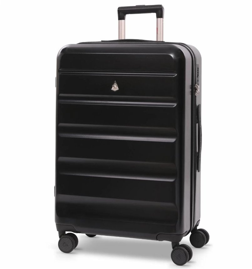 Cestovný kufor – na kolieskach, stredný, škrupinový, objem 67 l, rozmery 67 × 45 × 26 cm (V׊×H), upínacie pásy, vnútorné vrecko a vnútorná deliaca priehradka, 4 otočné a zdvojené kolieska, zapínanie dvojcestným zipsom, TSA zámok, bočné a horné držadlo, čierna farba, hmotnosť 3,75 kg