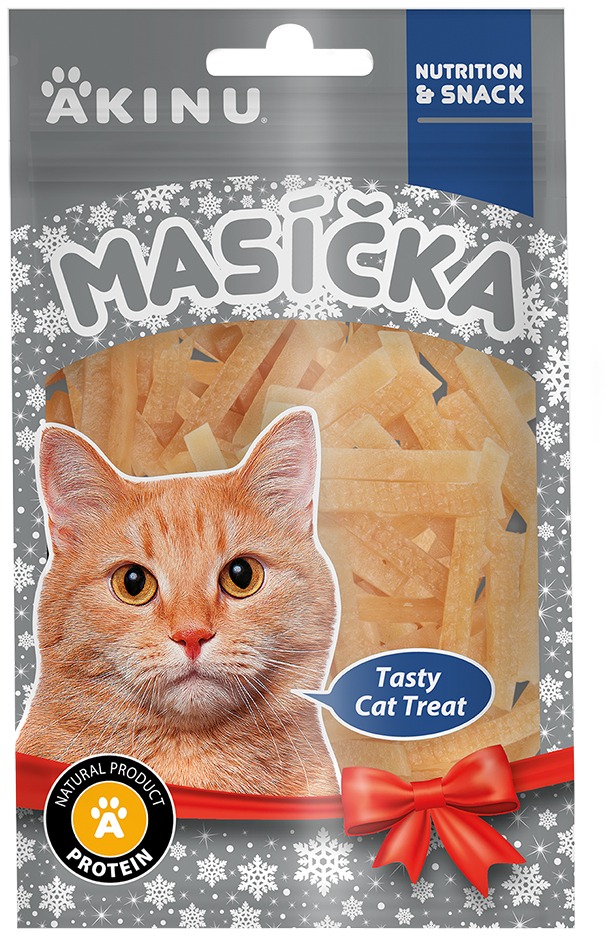 Sušené mäso pre mačky – pre všetky plemená s normálnou aktivitou, kuracia príchuť, živočíšne bielkoviny 45 %, bez obilnín Kuracie rezanky Akinu predstavujú chutnú desiatu s 96 % obsahom jemného mäsa, ktorá príjemne prekvapí maškrtný jazýček každej mačky – všetkých plemien i veku. Dobre sa trávi, poteší nízkym podielom tu