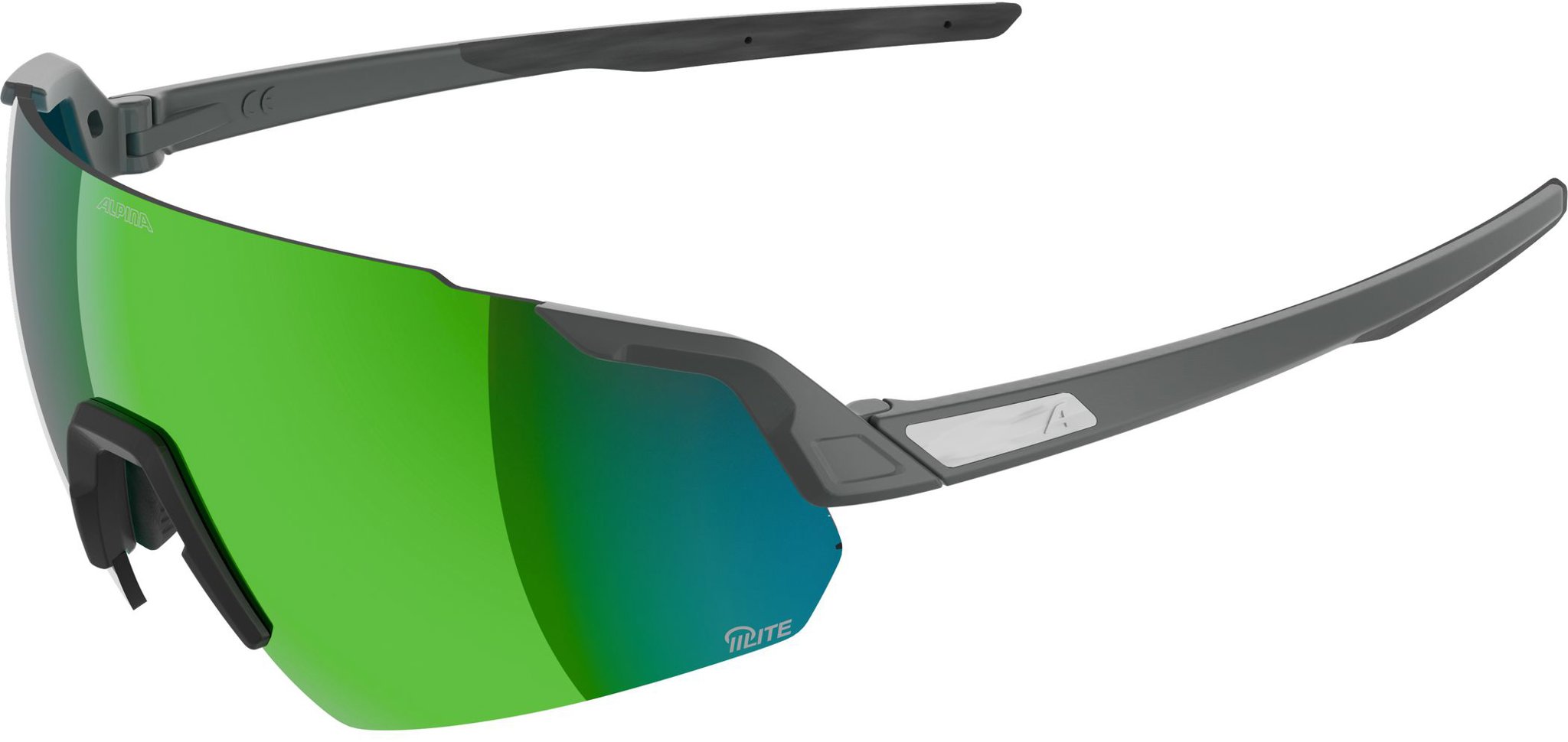 Cyklistické okuliare – unisex, tmavnúce, polarizačné a nezahmlievajúce sa, modrá a zelená farba skiel, svetelná priepustnosť S1 a S2, nastaviteľný nosník, pružný rám, protišmykové nožičky, bez rámu, sivá farba rámika, mäkký nosník súčasťou, UV ochrana UVA, UVB a UVC, rozmery zorníkov 5,7 × 14 cm (V׊), dĺžka nožičiek 17,5 cm, hmotnosť 28 g