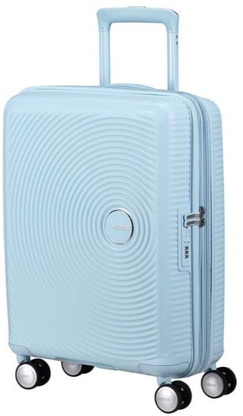Cestovný kufor – na kolieskach, malý, objem 35,5 l, rozmery 55 × 40 × 20 cm (V׊×H), vnútorné vrecko a vnútorná deliaca priehradka, 4 zdvojené kolieska, zapínanie dvojcestným zipsom, TSA zámok, teleskopické držadlo, modrá farba, hmotnosť 2,6 kg Cestovný kufor American Tourister Soundbox Spinner 55 EXP je ideálny na kratšie a stredne dlhé cesty. Môžete si ho vziať aj na palubu 38 rôznych leteckých spoločností, ako je Aegean Airlines, Aeroflot