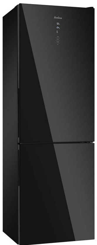 Chladnička s mrazničkou – energetická trieda E, objem chladničky 223 l, objem mrazničky 94 l, 4 police, voliteľné umiestnenie pántov, LED osvetlenie, total No Frost, rozmery 185,5 × 59,5 × 64,2 cm (V׊×H) Kombinovaná chladnička AMICA FK3356.4GBDFZAA v elegantnom prevedení z čierneho skla ponúka celkový objem 317 l, z toho 223 l pre chladiacu časť a 94 l pre mrazničku. Spotrebič patrí do energetickej tr