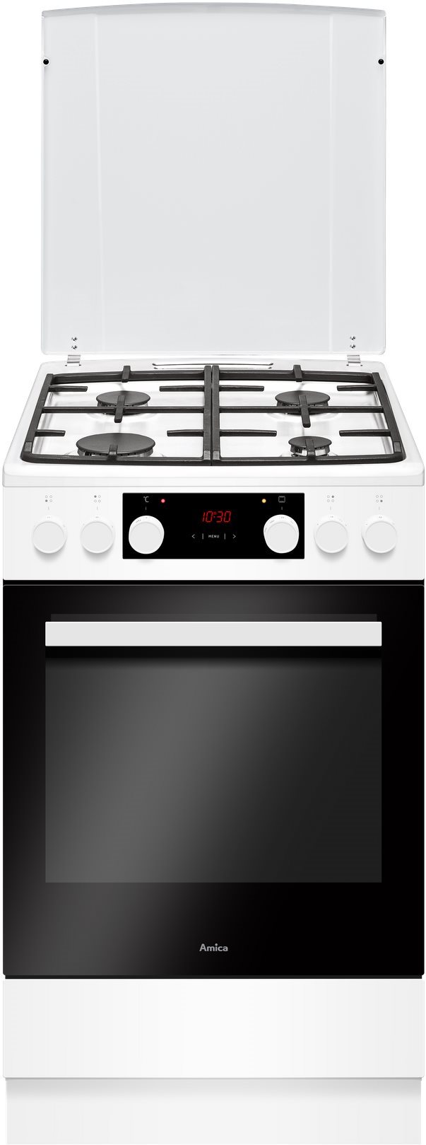 Sporák – kombinovaný, energetická trieda A, rozmery 85 × 50 × 60 cm (V׊×H), 4 platničky, VARNÁ DOSKA: bezpečnostná poistka horáka a automatické zapaľovanie, ovládanie pomocou otočných gombíkov, príklop, liatinová mriežka a displej súčasťou dosky, RÚRA: tlmené dovieranie dverí, programy rúry rýchle predhriatie, gril, horný ohrev, spodný ohrev, dolný + horný ohrev, rozmrazovanie a ventilátor, biela farba Prišiel čas na renováciu kuchyne či výmenu starého sporáka? Kombinovaný sporák s plynovou varnou doskou AMICA splní vaše požiadavky pri každodennom varení. Jeho príkon je 3,5 kW. Na prípravu vašich ob