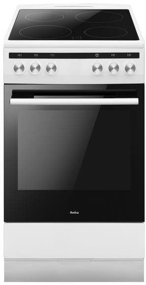Sporák – elektrický, sklokeramická varná doska, energetická trieda A, rozmery 85 × 50 × 60 cm (V׊×H), 4 platničky, VARNÁ DOSKA: ukazovateľ zvyškového tepla, ovládanie pomocou otočných gombíkov, RÚRA: programy rúry gril, horný ohrev a spodný ohrev, biela farba Rozhodli ste sa pre renováciu kuchyne a budete potrebovať nový sporák? Elektrický sporák so sklokeramickou varnou doskou AMICA je vybavený všetkým, čo potrebujete na každodenné varenie. Jeho príkon do
