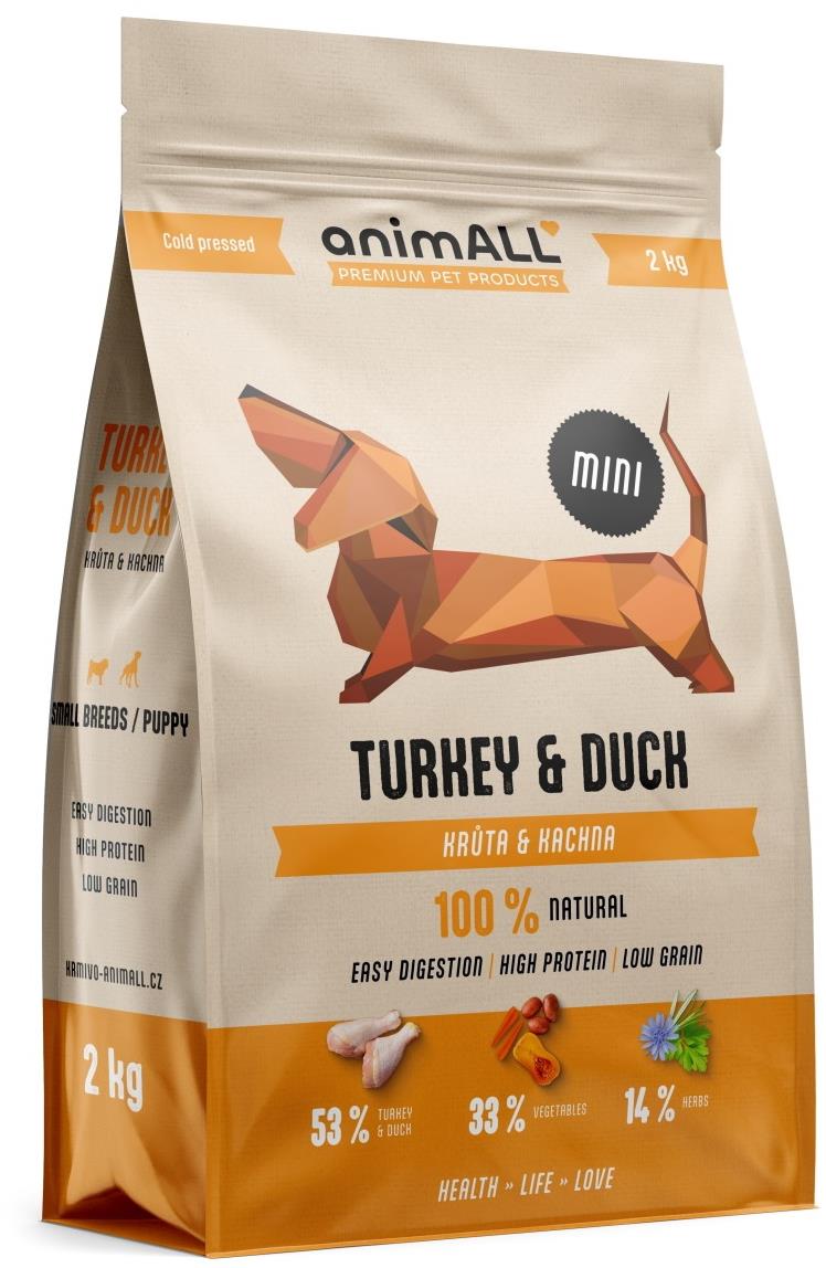 Granuly pre psov – pre malé plemená šteňacieho, dospelého veku s nízkou aktivitou, kačacia a morčacia príchuť, hmotnosť balenia 2 kg, suché, tuky (živočíšny) 14 %, špecifiká zloženia bez konzervantov, bez GMO a za studena lisované Granuly pre psov animALL Mini Turkey & Duck sú navrhnuté špeciálne pre šteňatá všetkých plemien a dospelých psov malého vzrastu s nižšou záťažou, citlivým zažívaním a náročnými chuťovými preferenc