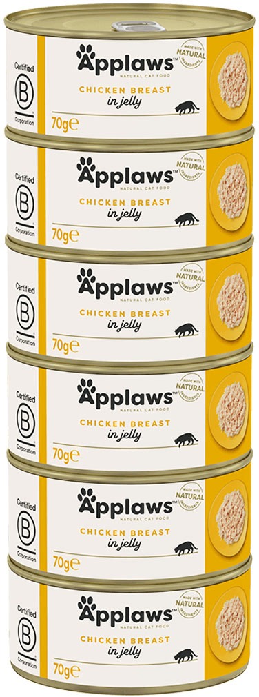Konzerva pre mačky – bez obmedzenia veku s normálnou aktivitou, kuracia príchuť, hmotnosť balenia 0,07 kg, 6 ks v balení, mokré, hrubé bielkoviny 13 %, tuky (živočíšny) 1 %, bez obilnín Doplnkové krmivo Applaws s jemnou štruktúrou a výnimočnou chuťou patrí medzi najobľúbenejšie konzervy pre dospelé mačky. Obsahuje 60 % kvalitného mäsa z kuracích pŕs v lahodnom želé. Hypoalergénne čis