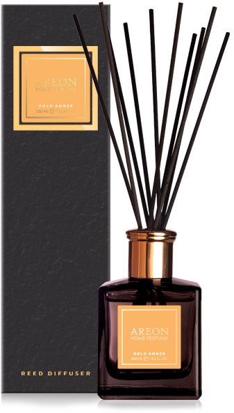 Tyčinkový difuzér – výdrž vône 91 d, 10 tyčiniek, objem 150 ml Aróma difuzér AREON Home Perfume BLACK Gold Amber je určený do vnútorných priestorov. Unikátny osviežovač vzduchu s desiatimi drevenými tyčinkami a skleneným flakónom s parfumom vydrží aj niekoľko mes