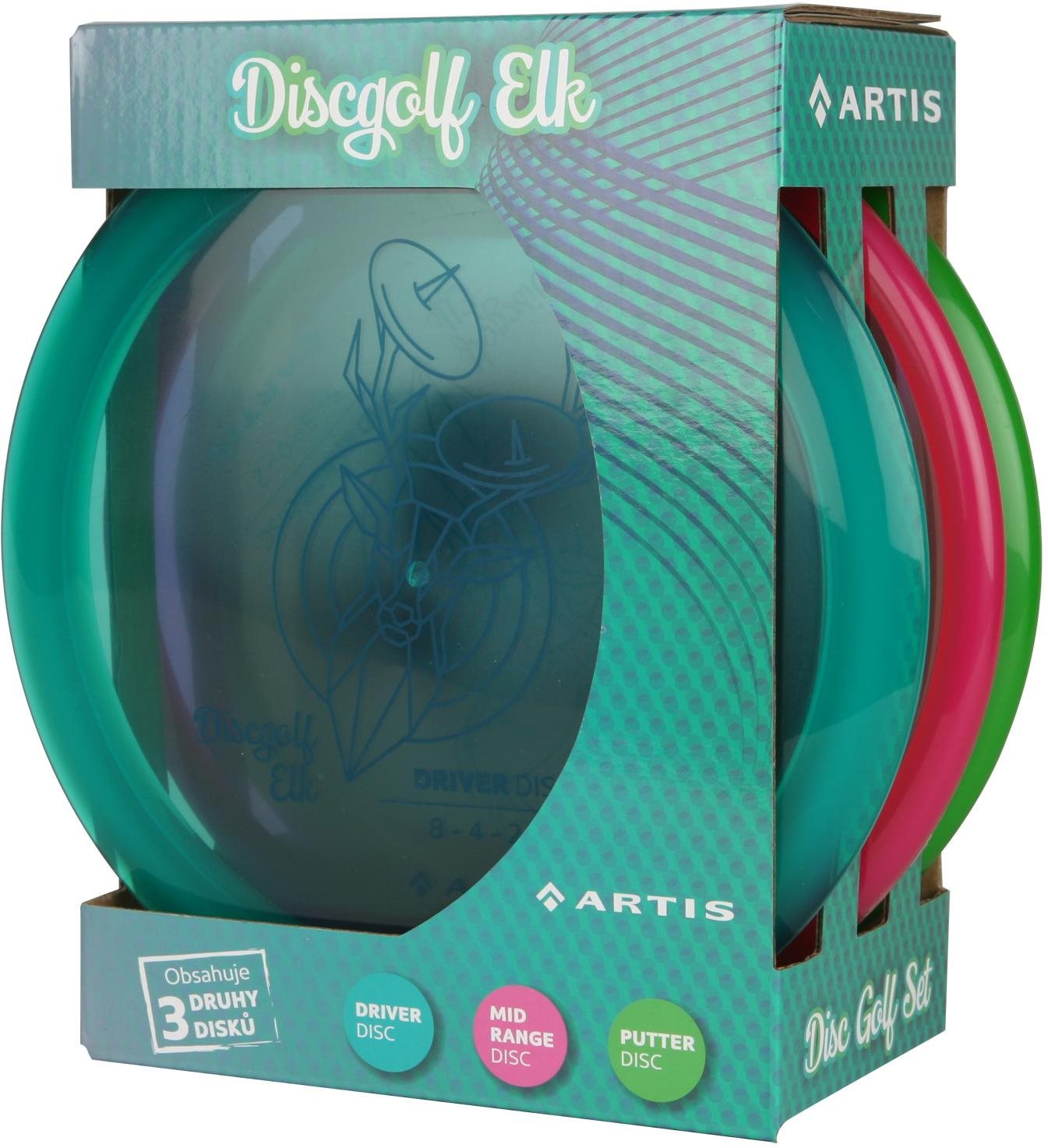 Discgolf súprava – tri rôzne disky na discgolf Sada Artis Discgolf Elk predstavuje nepostrádateľný doplnok na discgolf. Obsahuje 3 disky, ktoré sa líšia farbou, výškou, hmotnosťou aj určením. Súčasťou sady je driver disk vhodný na hody na