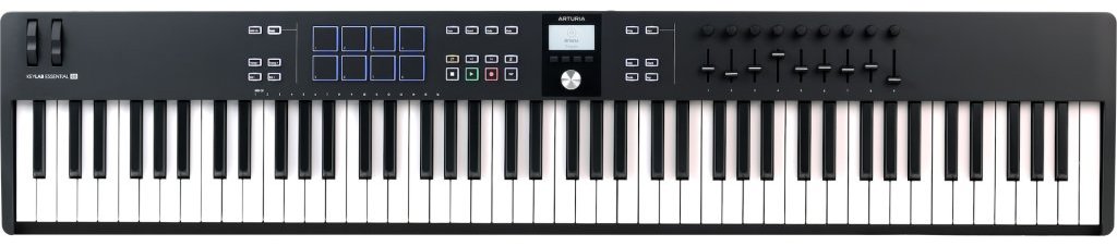 MIDI kontrolér – univerzálny klávesový kontrolér na hudobnú produkciu a DAW, 88 dynamických klávesov, 8 dynamických padov, 9 enkóderov, 9 sliderov, transportné tlačidlá, MIDI výstup, vstup na pedál, USB napájanie Arturia Key. Lab Essential 88 mk3…
