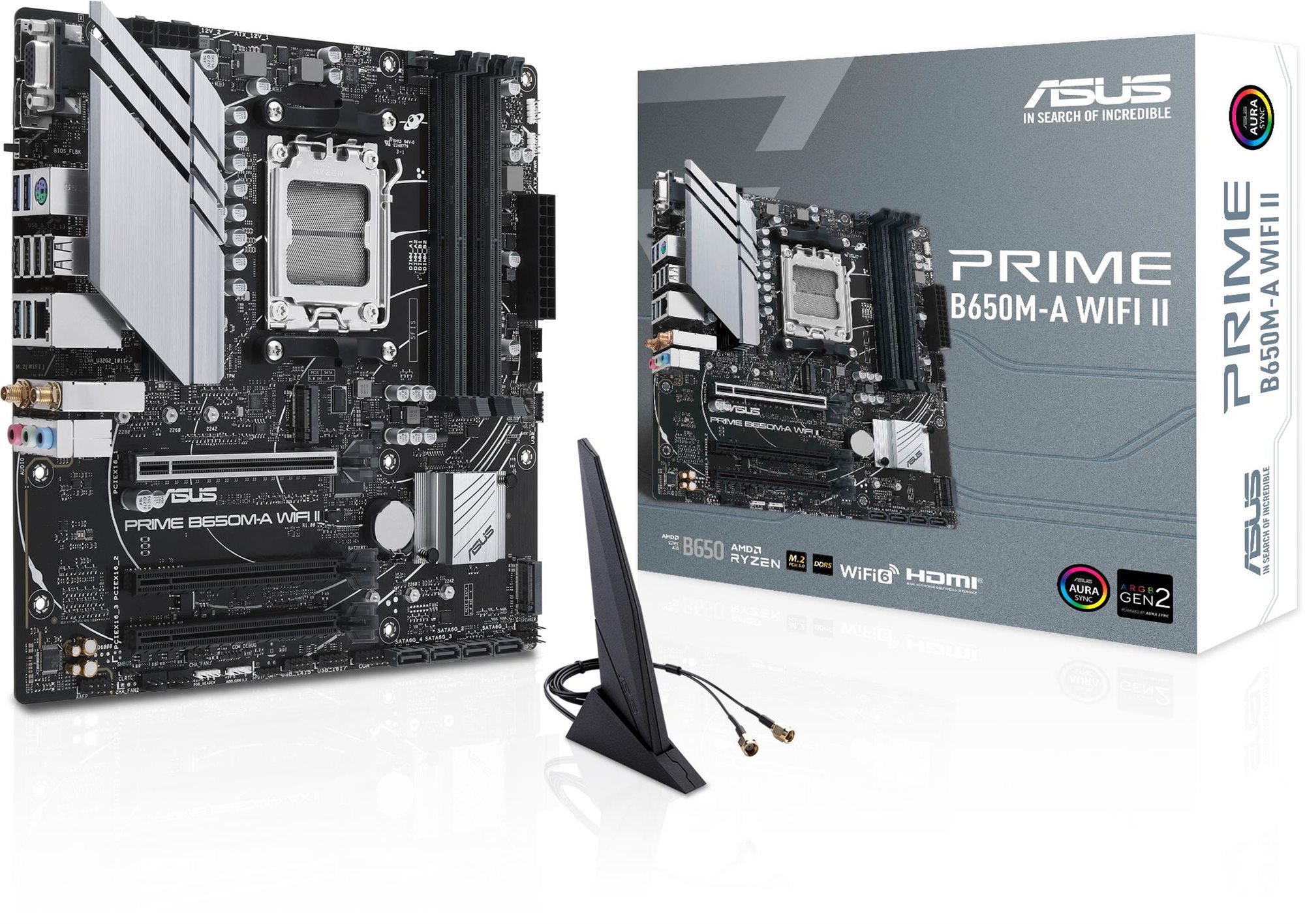 Základná doska – AMD B650, socket AMD AM5, rozmer mATX (Micro ATX), 4× DDR5, 6400 MHz (OC), 3× PCIe x16, 4× SATA III, 2× M.2, RJ-45 (LAN) 2,5 Gbps, 2× USB 3.2 Gen 2, 2× USB 3.2.Gen 1 (USB 3.0), 4× USB 2.0, DisplayPort 1.4, HDMI 2.1, 8ch zvuková karta Rad základných dosiek ASUS Prime je odborne navrhnutý tak, aby naplno využil potenciál procesorov AMD Ryzen radu 7 000. Doska PRIME B650M-A WiFi II sa môže pochváliť robustnou konštrukciou napájania,