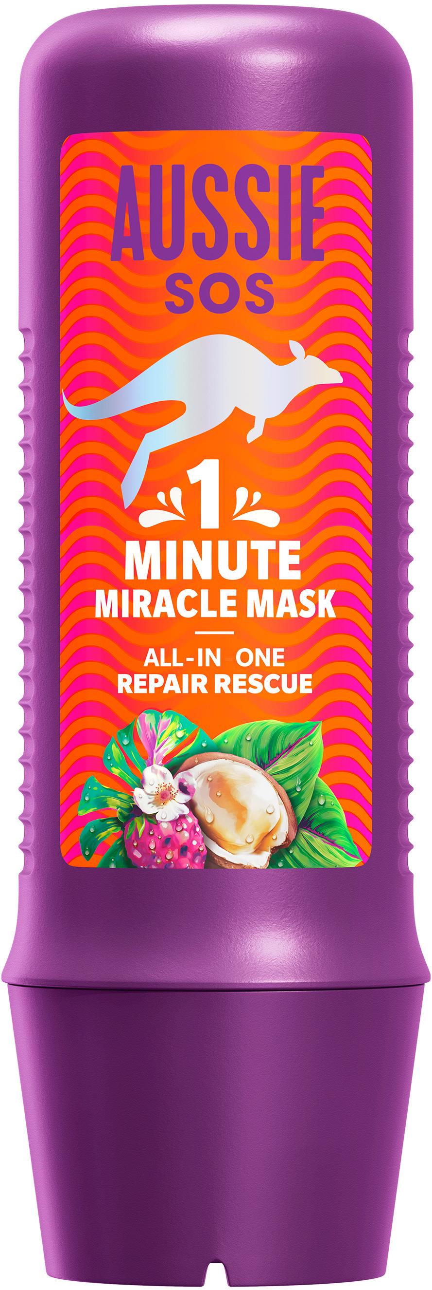 Maska na vlasy – na všetky typy vlasov, účinok: vyživujúci a regeneračný, objem 250 ml Maska AUSSIE SOS 1 Minute Miracle Repair Rescue poskytne všetkým typom vlasov hĺbkovú výživu a intenzívnu regeneráciu po celej ich dĺžke. Je obohatená o makadamový olej a výťažok z bielych jahôd, vďak