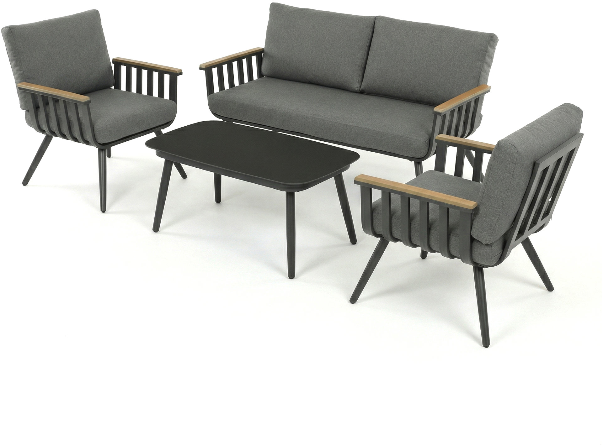 Záhradný nábytok – zostava, 2 stoličky, nosnosť 120 kg, 1 lavice, nosnosť 200 kg, stôl obdĺžnik, rozmer 96 cm × 55 cm × 42 cm, materiál sedadla/opierky chrbta lavice textil Záhradný set Verana s dvojmiestnou pohovkou, dvoma kreslami a stolíkom vytvorí príjemné miesto na oddych aj spoločné posedenie na terase alebo záhrade. Konštrukcia je vyrobená z ľahkého, ale pevného h