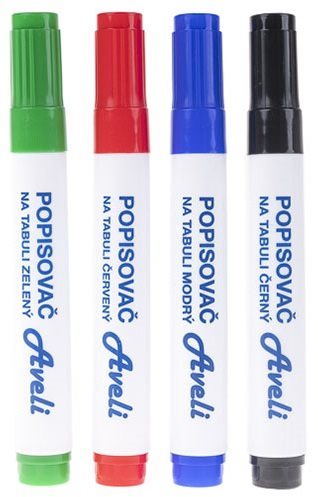 Popisovač – na papier a tabuľu, guľatý hrot, šírka stopy 2 mm, okrúhly úchop, 4 kusy v balení Nielen všetky učiteľky v škole ocenia okrem tabule aj súpravu 4 farebných popisovačov AVELI! Pri rôznych rokovaniach, stretnutiach a školeniach vám budú popisovače základných farieb vždy po ruke a mô
