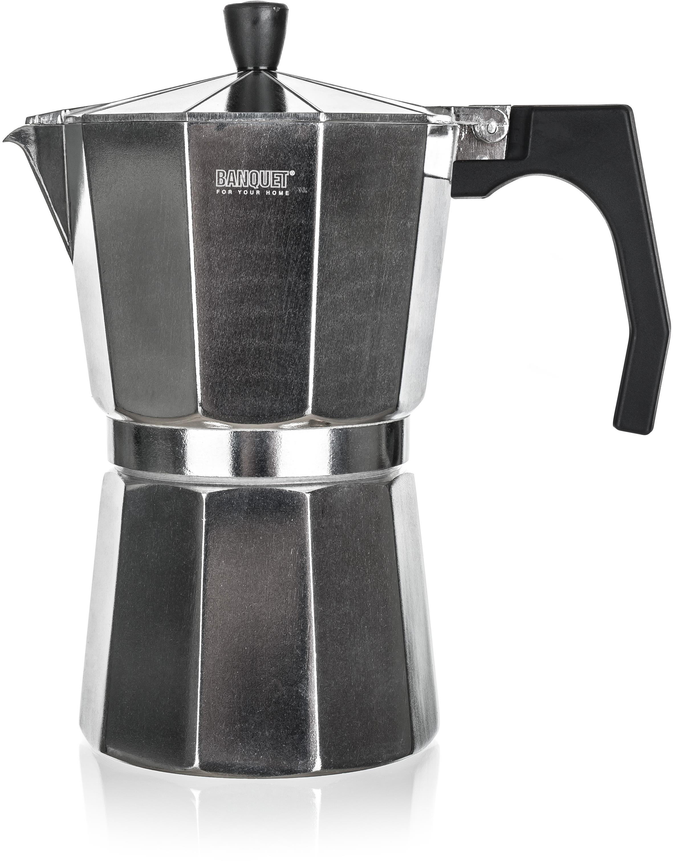 Moka kávovar – na sporák, zdroj ohrevu plyn, elektrina a sklokeramika, objem 400 ml, na jeden ohrev pripraví až 9 šálok, nevhodný do umývačky, materiál nehrdzavejúca oceľ, čierna a strieborná farba Doprajte si chvíľku pokoja so šálkou kvalitnej kávy vyhotovenej v moka kávovare Banquet. Tento taliansky typ kávovaru vám pripraví lahodnú kávu a zároveň štýlovo doplní váš kuchynský pult. Príprava ká