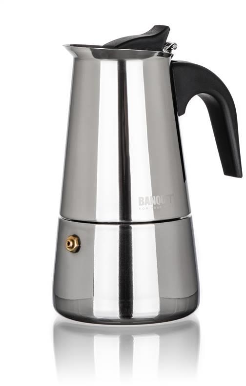 Moka kávovar – na sporák, zdroj ohrevu plyn, elektrina a sklokeramika, objem 200 ml, na jeden ohrev pripraví až 4 šálky, indukčné jadro, materiál nehrdzavejúca oceľ, strieborná farba Doprajte si šálku kvalitnej kávy pripravenej v moka kávovare Banquet. Tento taliansky typ kávovaru vám pripraví lahodnú kávu a zároveň dizajnovo doplní prostredie vašej kuchyne. Moka kanvička využíva