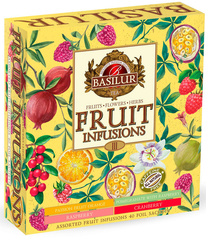 Čaj – ovocný, vrecká, súprava čajov, srílanský, hmotnosť 80 g, zloženie brusnica a malina BASILUR Fruit Infusions Assorted Vol. IIIPrebal, 40 gastro vreciekSúprava BASILUR Fruit Infusions Assorted Vol. III vám umožní vychutnať si 4 druhy čajov. Obsahuje ovocné čaje, ktoré sa veľmi jednoduc