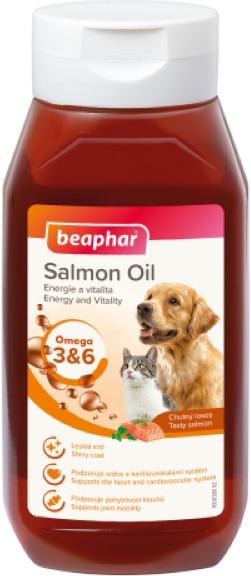 Olej pre psa – na zlepšenie kondície a vitality, pre všetky plemená, pre dospelé psy, objem 430 ml Lososový olej Beaphar predstavuje prirodzený zdroj energie pre psy všetkých veľkostí. Obsahuje 24 % omega-3 a 6 % omega-6 mastných kyselín, ktoré prospievajú srdcu a podporujú zdravý krvný obeh. Vďaka