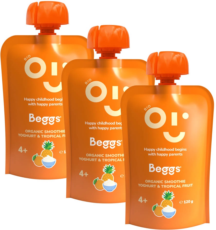 Kapsička pre deti – ovocné, pre deti od 4 mesiace, bez lepku, bez pridaného cukru, bio kvalita, v balení 3 ks Vrecko pre deti Beggs BIO Smoothie s jogurtom a tropickým ovocím, 3× 120 gDoprajte svojim najmenším lahodnú kombináciu jogurtu, sladkého banánu, sviežej pomarančovej šťavy a exotického ananásu v BIO k