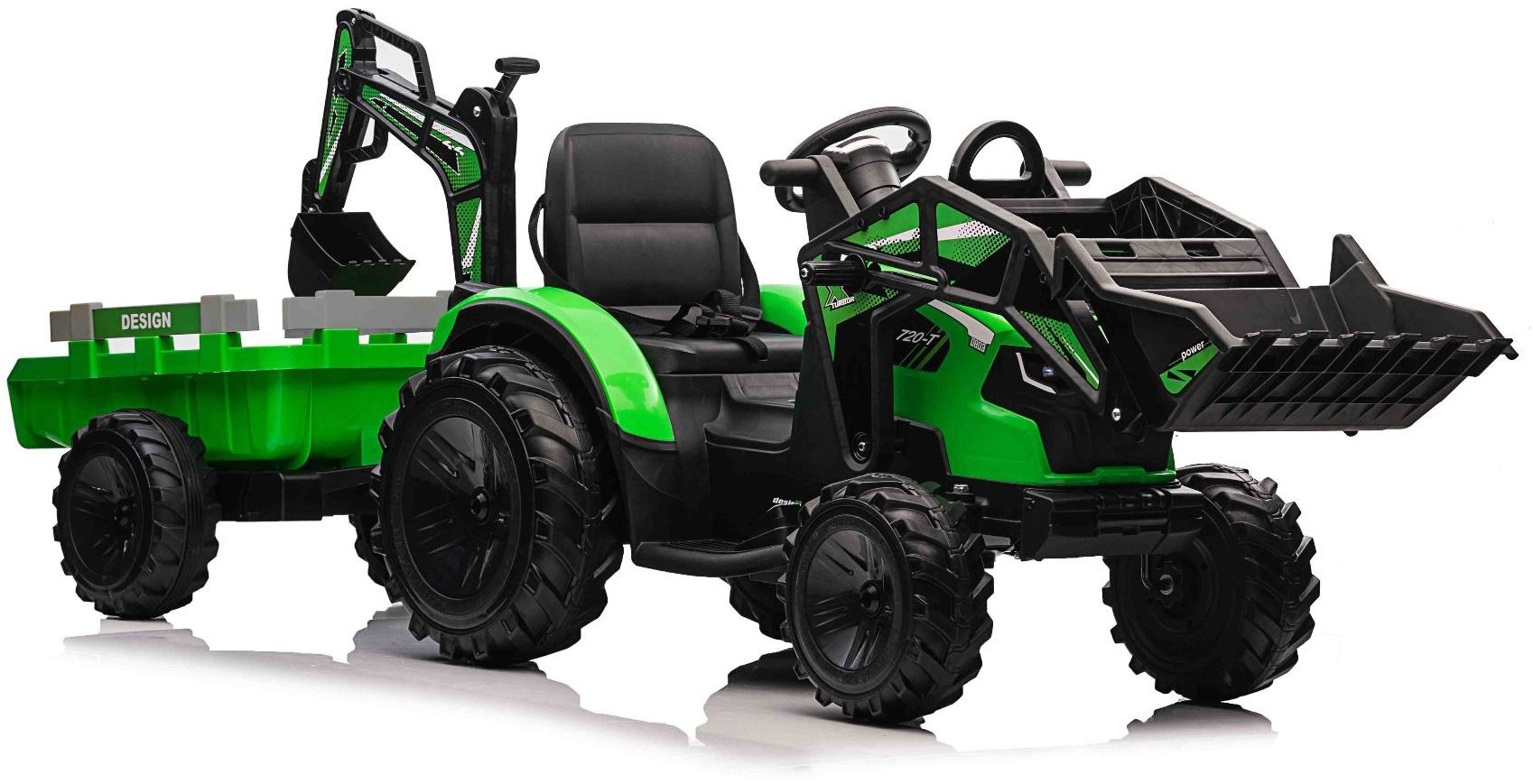 Elektrický traktor pre deti – vhodný od 3 rokov, s maximálnou rýchlosťou 6 km/h, s celkovým výkonom 90 W, doba jazdy na jedno nabitie je 150 min, nosnosť 30 kg, EVA kolesá, 1 miesto na sedenie, odkladací priestor, pásy na pripútanie, LED svetlá a indikátor batérie, v balení sa nachádza diaľkový ovládač a nabíjací adaptér, hmotnosť 29 kg Dostaňte sa za volant tohto úplne vynikajúceho traktora TOP-WORKER – 2× 45 W motor s lítiovou batériou, predná aj zadná naberačka/funkčná ruka pre nakládku. Rýchlosť do 6 km/hod. Doprajte svojim deťom