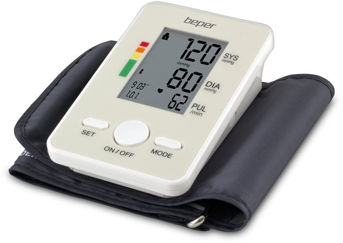 Tlakomer na rameno – oscilometrická metóda merania, meria systolický tlak, diastolický tlak, pulzovú frekvenciu a arytmiu, automatické vypnutie, priemer z nameraných hodnôt, dátum a čas, v pamäti udrží 120 meraní, na 4 AAA batérie, ochranný obal v balení, biela farba, hmotnosť 150 g Tlakomer BEPER 40120 na zobrazenie systolického a diastolického tlaku súčasne. Zariadenie je schopné rozpoznať nepravidelný srdcový rytmus a spriemerovať tri posledné merania. Tlakomer má pamäť na 120