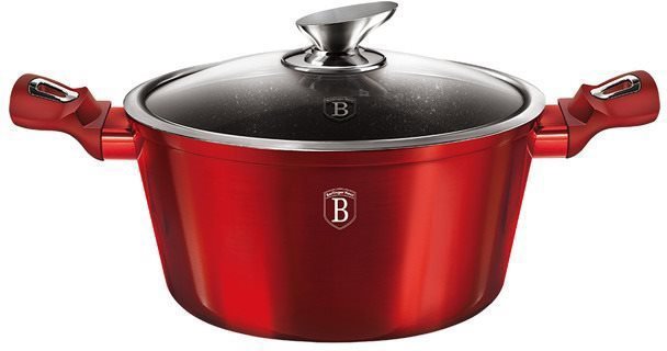 Kastról – mramorový, vhodný na plynovú, elektrickú, indukčnú a sklokeramickú varnú dosku, okrúhly tvar, objem 4,1 l, plastová rukoväť, ergonomická rukoväť, nepriľnavý povrch, použitie v rúre a možnosť umývania v umývačke, výška 11,8 cm, priemer 24 cm, pokrievka v balení, čierna a červená farba Vďaka elegantnému hrncu BerlingerHaus pôjde varenie ľahko a jednoducho. Základom hrnca je kovaný hliník, potiahnutý 3 vrstvami mramoru. Vonkajší vzhľad umocňuje červená metalická farba. Hrniec je vhod