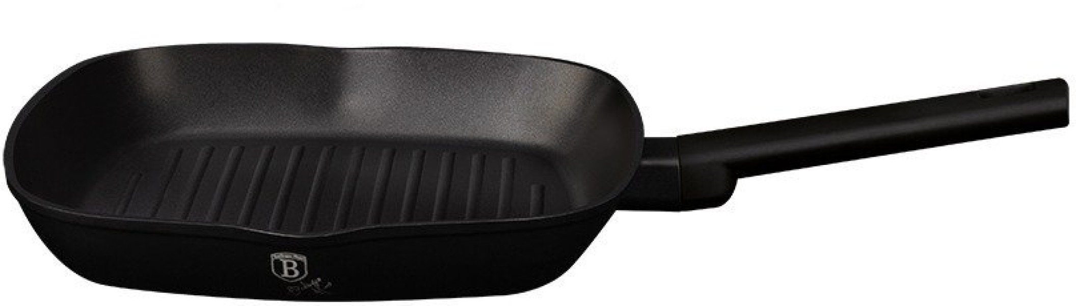 Panvica – grilovacia, hranatá, telo panvice z hliníka, vhodná na elektrickú, plynovú, sklokeramickú aj indukčnú varnú dosku, možnosť použitia neostrého kovového náčinia, vylievací okraj a možnosť umývania v umývačke, titánový vonkajší povrch, protišmyková, ergonomická, silikónová rukoväť, hrubé dno, maximálna teplota pri pečení v rúre 160 °C, rozmery 4,1 × 28 × 28 cm (V׊×D), farba čierna Grilovacia panvica BerlingerHaus Monaco Collection z kovaného hliníka s nepriľnavou vrstvou TitanPro prináša vysokú kvalitu a odolnosť proti poškriabaniu. Ergonomická mäkká protišmyková rukoväť a turb