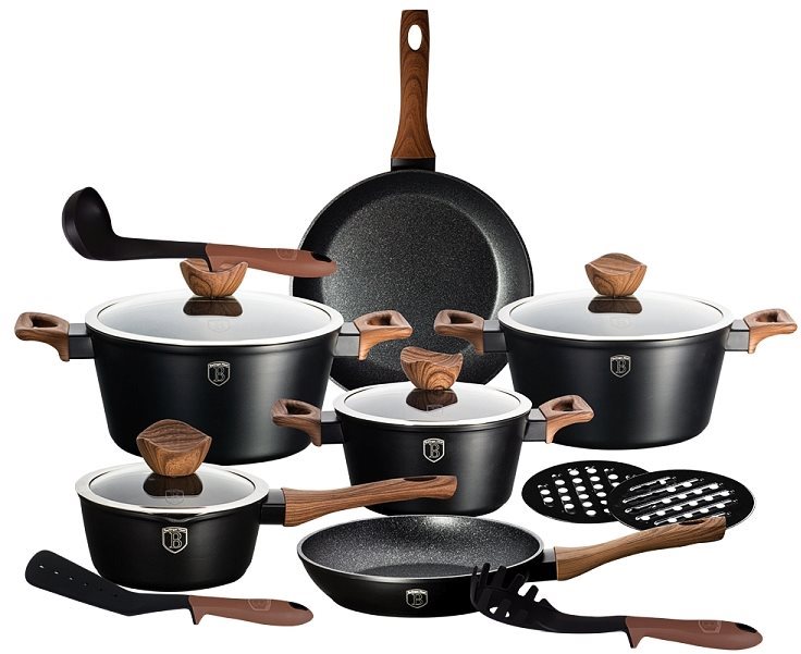 Sada riadu na varenie – na plynovú, elektrickú, indukčnú a sklokeramickú varnú dosku, 4 hrnce a 2 panvice v súprave, dvojstenná konštrukcia, použitie v rúre a možnosť umývania v umývačke, maximálna teplota na pečenie v rúre 160 °C, telo tvorí hliník, hliníkový vonkajší povrch hrnca, mramorový vnútorný povrch hrnca, drevená rukoväť hrnca, drevená rukoväť panvice, obracačka a pokrievka v balení, čierna farba BerlingerHaus Ebony Line Rosewood je luxusnou sadou riadu, ktorá obohatí každú kuchyňu a pretvorí varenie na skutočný zážitok. Sada obsahuje všetko, čo je pre prípravu pokrmov potreba – hlbokú