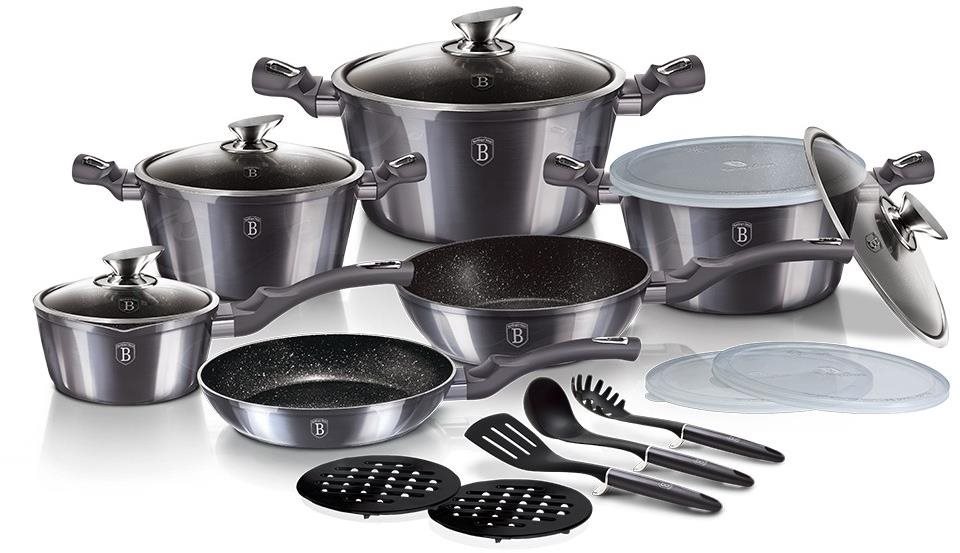 Sada riadu na varenie – na plynovú, elektrickú, indukčnú, sklokeramickú a halogénovú varnú dosku, 4 hrnce a 2 panvice v súprave, ergonomická rukoväť, nepriľnavý povrch, použitie v rúre a možnosť umývania v umývačke, maximálna teplota na pečenie v rúre 160 °C, telo tvorí hliník, lakovaný vonkajší povrch hrnca, mramorový vnútorný povrch hrnca, silikónová rukoväť hrnca, mramorový vnútorný povrch panvice, silikónová rukoväť panvice, obracačka, pokrievka a podložka v balení, sivá farba Bohato vybavená sada riadu BERLINGERHAUS Carbon PRO Line z metalickej striebornej kolekcie zaujme nielen neprehliadnuteľným moderným dizajnom, ale predovšetkým svojimi jedinečnými vlastnosťami. Doméno