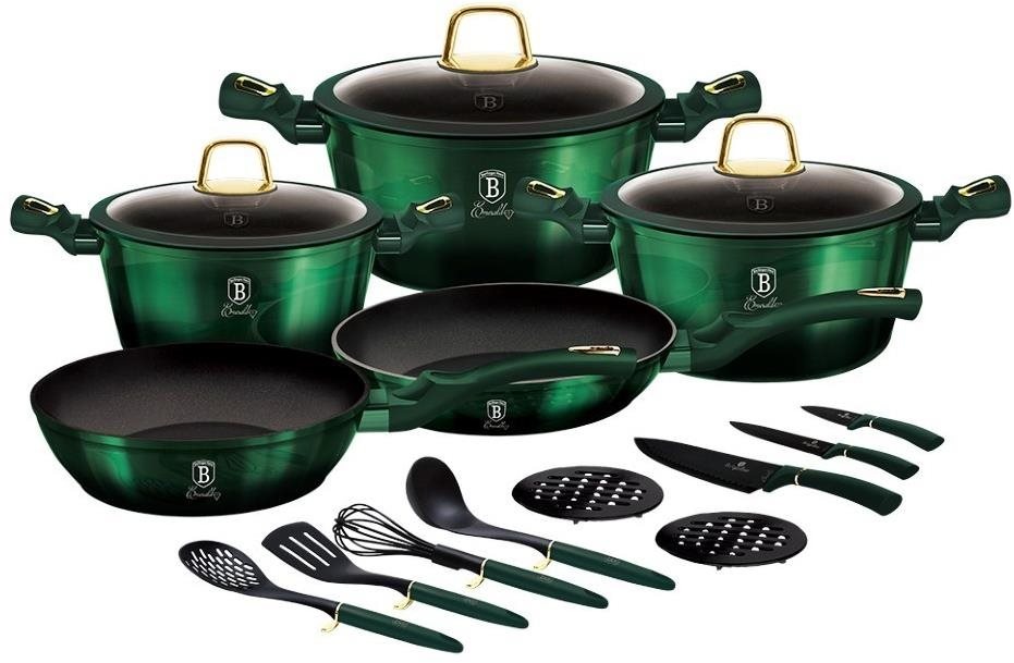 Sada riadu na varenie – na plynovú, elektrickú, indukčnú a sklokeramickú varnú dosku, 3 hrnce a 2 panvice v súprave, nepriľnavý povrch, použitie v rúre a možnosť umývania v umývačke, maximálna teplota na pečenie v rúre 160 °C, telo tvorí hliník, liatinový vonkajší povrch hrnca, titánový vnútorný povrch hrnca, titánový vnútorný povrch panvice, hliníkový vonkajší povrch panvice, lyžica, obracačka, pokrievka, podložka, naberačka, metlička a nôž v balení, zelená farba Súprava riadu Berlingerhaus Emerald Collection zaujme na prvý pohľad luxusným dizajnom. Obsahuje panvicu, hlbokú panvicu, tri kastróly, dve podložky pod horúci riad, 3 pokrievky, 3 kuchynské nože a 4
