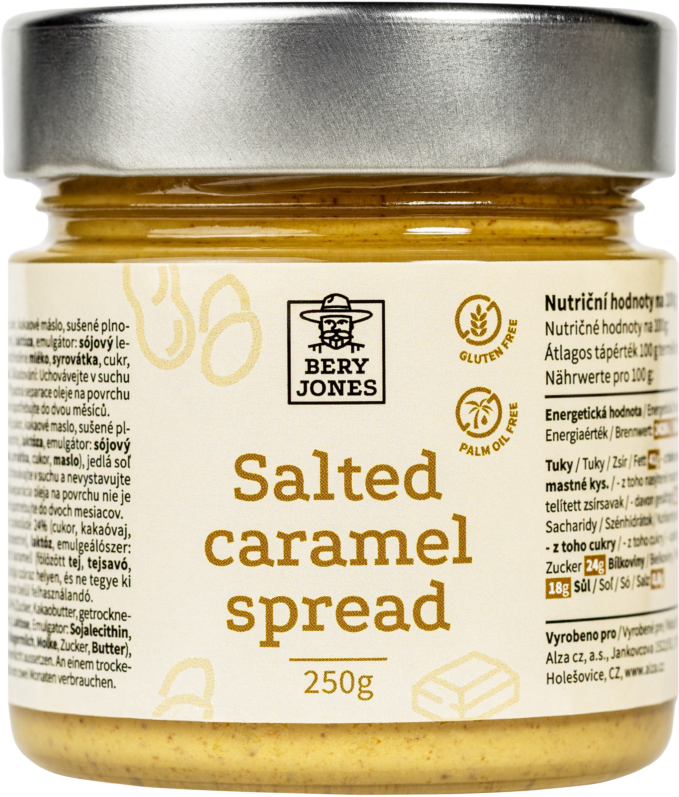 Orechový krém – jemný, arašidový, príchuť slaný karamel, 18 g bielkovín na 100 g, 579,92 kcal na 100 g, neobsahuje lepok, bez palmového oleja, hmotnosť 250 g Orechový krém Bery Jones Salted Caramel spread 250 gPríchuť Salted Caramel vám prináša zmes arašidov a slaného karamelu. Jemný orechový krém Bery Jones s príchuťou arašidov a bielej čokolády s karamel