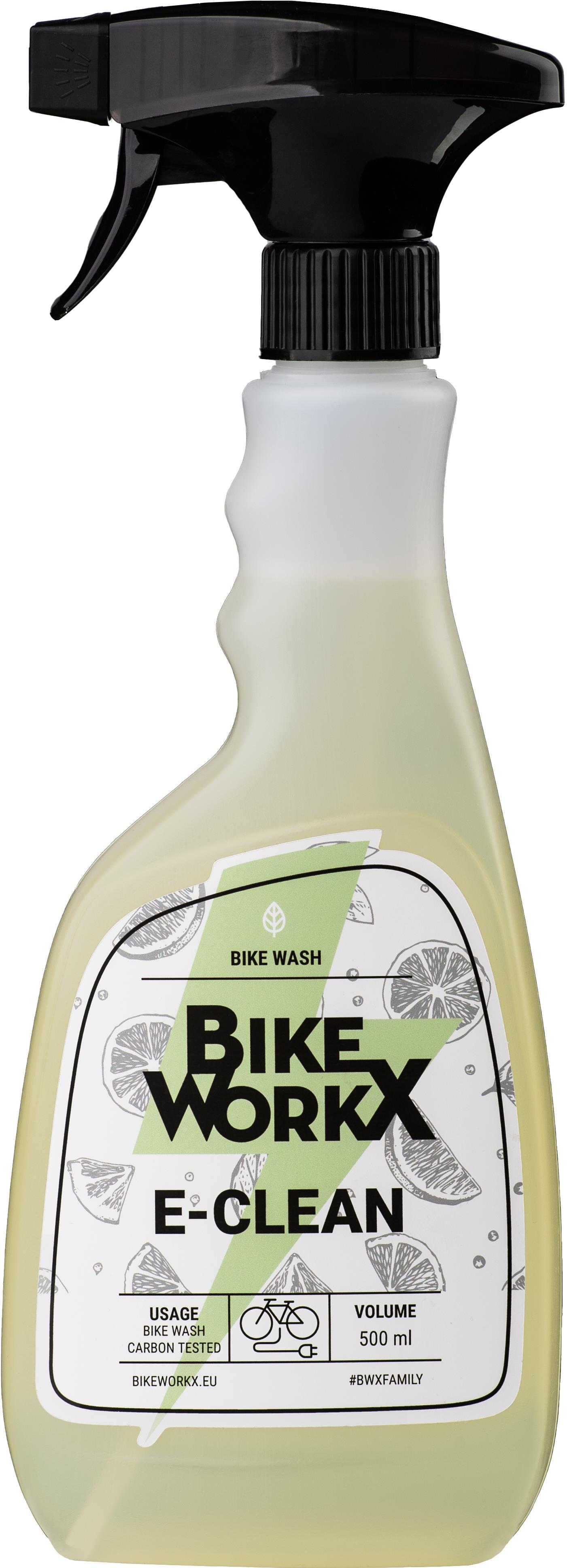 Čistič na bicykel – rozprašovač, vhodný na kov, na rám, vhodný pre elektrobicykle, objem 500 ml BikeWorkx E-Clean je vysoko účinný čistiaci prostriedok určený na údržbu elektrobicyklov. Vďaka vysokej penivosti efektívne odstraňuje blato a ďalšie nečistoty a zároveň zaisťuje nižšiu spotrebu prost
