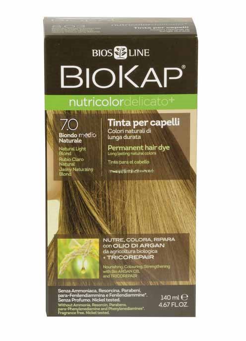 Farba na vlasy – blond, permanentná, tekutá, bez amoniaku, komplexné zafarbenie, na všetky typy vlasov, rukavice, aplikátor, vlasová výživa a návod v balení, objem 140 ml Vlasy sú ozdobou ženy. Doprajte vlasom prvotriednu starostlivosť – zvoľte si farbu BIOKAP Nutricolor Delicato Natural Medium Blond. Zloženie bez amoniaku zaistí vysokú akceptovateľnosť a zanechá vlasy