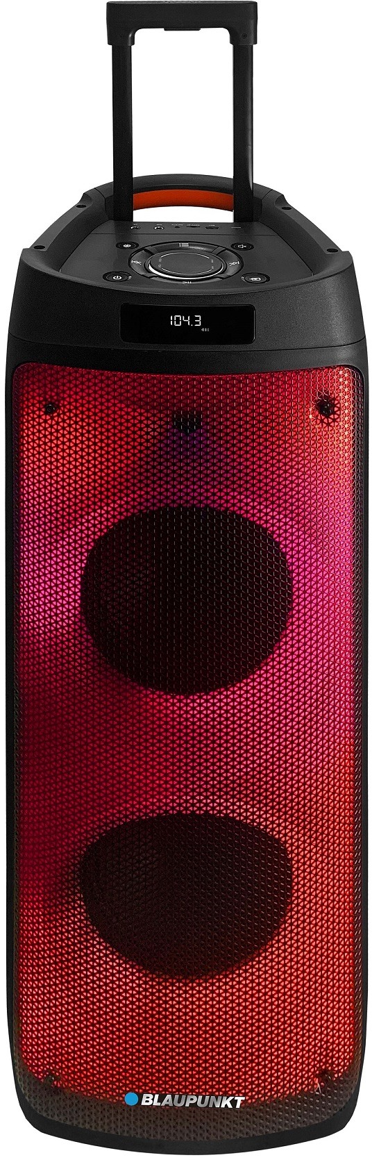 Bluetooth reproduktor – aktívny, s výkonom 700 W, párty, s rádiom, s mikrofónom, s prehrávaním USB flash, s True Wireless Stereo, 6,3 mm Jack, AUX, Bluetooth 5.0, podpora mp3, displej, diaľkový ovládač, výdrž batérie 4 h Blaupunkt PB08DB je výkonný Bluetooth reproduktor s výkonom 700 W, určený na vnútorné aj vonkajšie použitie. Využíva 8 V batériu s kapacitou 7 Ah, ktorá zaisťuje až 4 hodiny prevádzky na jedno nabitie