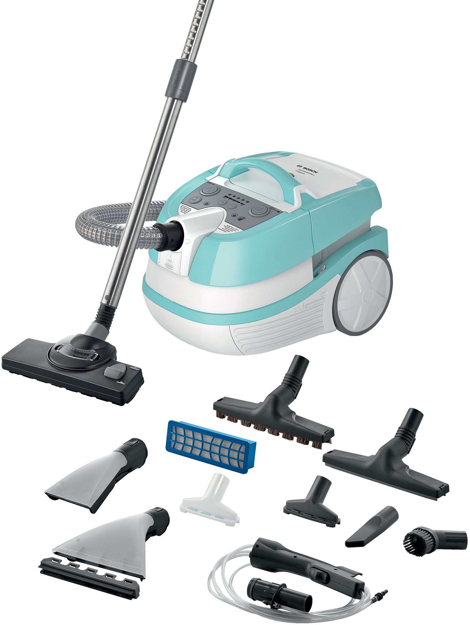 Viacúčelový vysávač – na všetky typy podláh, na vysávanie, mokré čistenie a suché čistenie, objem zbernej nádoby 3,5 l, HEPA a vodný, ovládanie na tele, dĺžka kábla 9 m, akčný rádius 12 m, teleskopická trubica súčasťou balenia, s káblom, hlučnosť 85 dB, biela a modrá farba Select brand: Viacúčelové vysávače BOSCH/viacucelove-vysavace/bosch/18855450-v1877.htmBOSCH BWD420HYGVýkonný antialergénny vysávač Bosch ProHygienic BWD420HYG si poradí ako so suchým, tak aj
