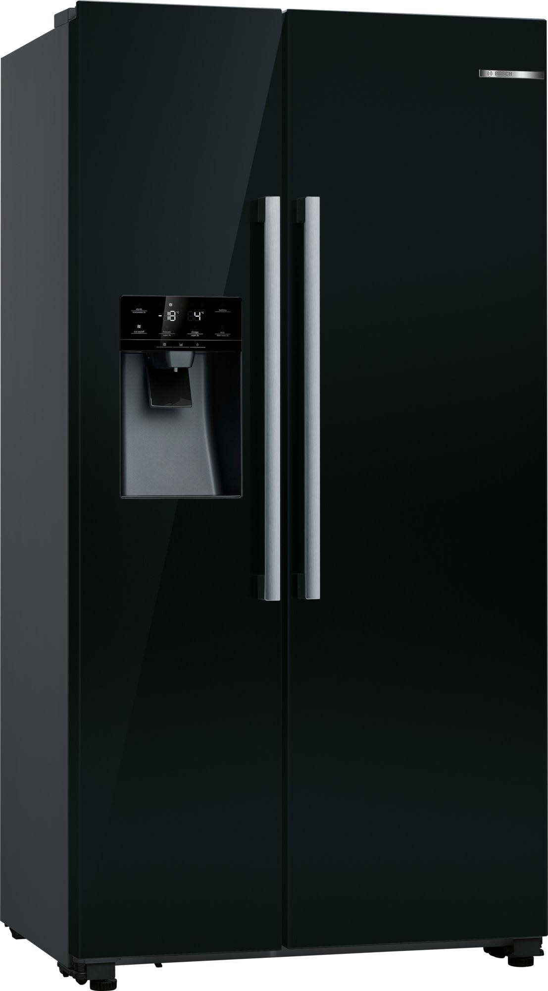 Americká chladnička – dvojdverová, energetická trieda E, objem chladničky 371 l, objem mrazničky 191 l, voliteľné umiestnenie pántov, 5 políc, 5 priehradiek v mrazničke, 1 chladiaci okruh, nulový nábeh dverí, rozmery 178,7 × 90,8 × 70,7 cm (V׊×H) Práčky BOSCHAmerická chladnička BOSCH KAD93ABEP Serie 6Priestranná americká chladnička BOSCH KAD93ABEP Serie 6 s kapacitou 371 litrov chladiacej časti a 191 litrov mrazničky ponúka praktický výrobník