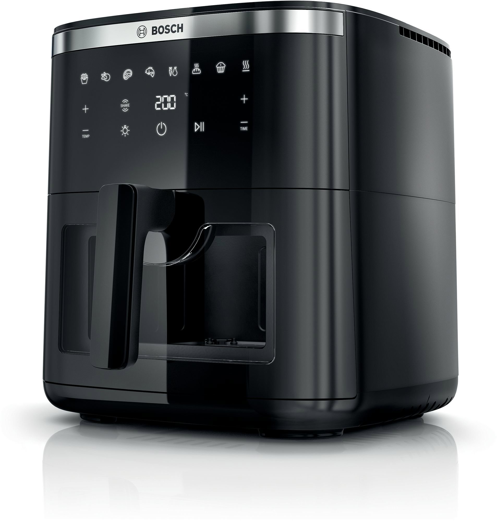 Teplovzdušná fritéza – digitálne ovládanie, nastaviteľná teplota od 40 do 200 °C, s nepriľnavým povrchom, s displejom, s vekom s priezorom, s vnútorným osvetlením, časovač, udržanie teploty, regulácia teploty a automatické programy, 8 programov, vyberateľná nádoba súčasťou, príkon 1800 W, objem nádoby 7,2 l s nepriľnavým povrchom, 1 fritovací kôš, dĺžka kábla 0,9 m, hmotnosť 5,9 kg, rozmery 31,4 × 30,9 × 38,5 cm (V׊×H), čierna farba Fritézy BOSCHTeplovzdušná fritéza BOSCH MAF671B0 Serie 6Objavte moderný spôsob varenia s teplovzdušnou fritézou BOSCH MAF671B0 Serie 6. Umožní vám pripraviť chutné a chrumkavé jedlá s minimom oleja, a
