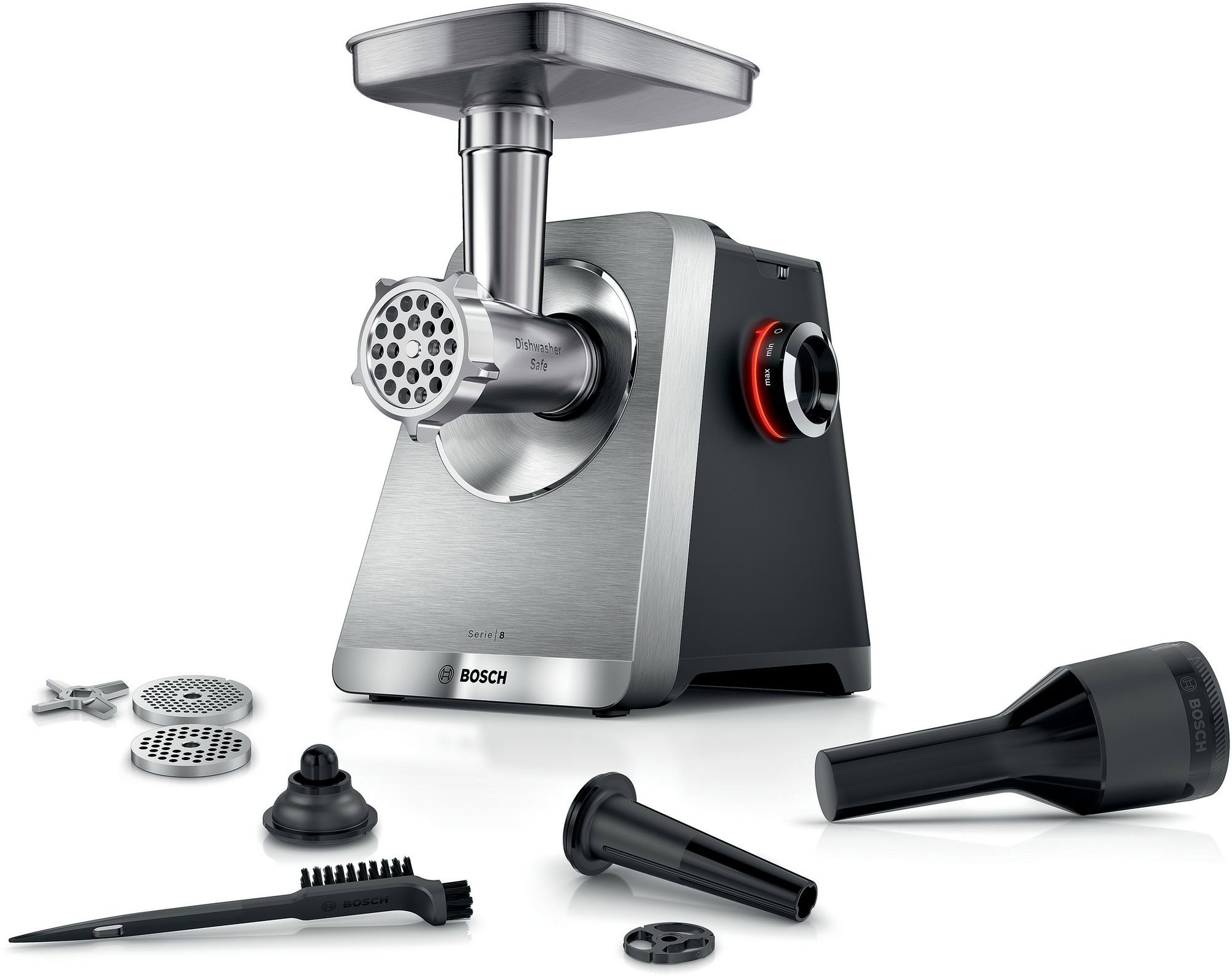 Mlynček na mäso – elektrický, príkon 2500 W, veľký plniaci otvor, gumové nožičky, regulácia výkonu, s obojstranným nožom, s úložným priestorom a spätný chod, na plnenie párkov a klobás a mletie, 2 rýchlosti, rýchlosť spracovania mäsa 4,5 kg/min, hrubosť mletia 3 mm, vtláčadlo, kibbeh, 4,5, adaptér na klobásy a mlecie doštičky v balení, veľkosť mlynčeka 8, materiál plast, hliník, nehrdzavejúca oceľ a BPA Free, rozmery 26,3 × 18,9 × 25,8 cm (V׊×H), hmotnosť 4,7 kg, vo farbe nehrdzavejúcej ocele
