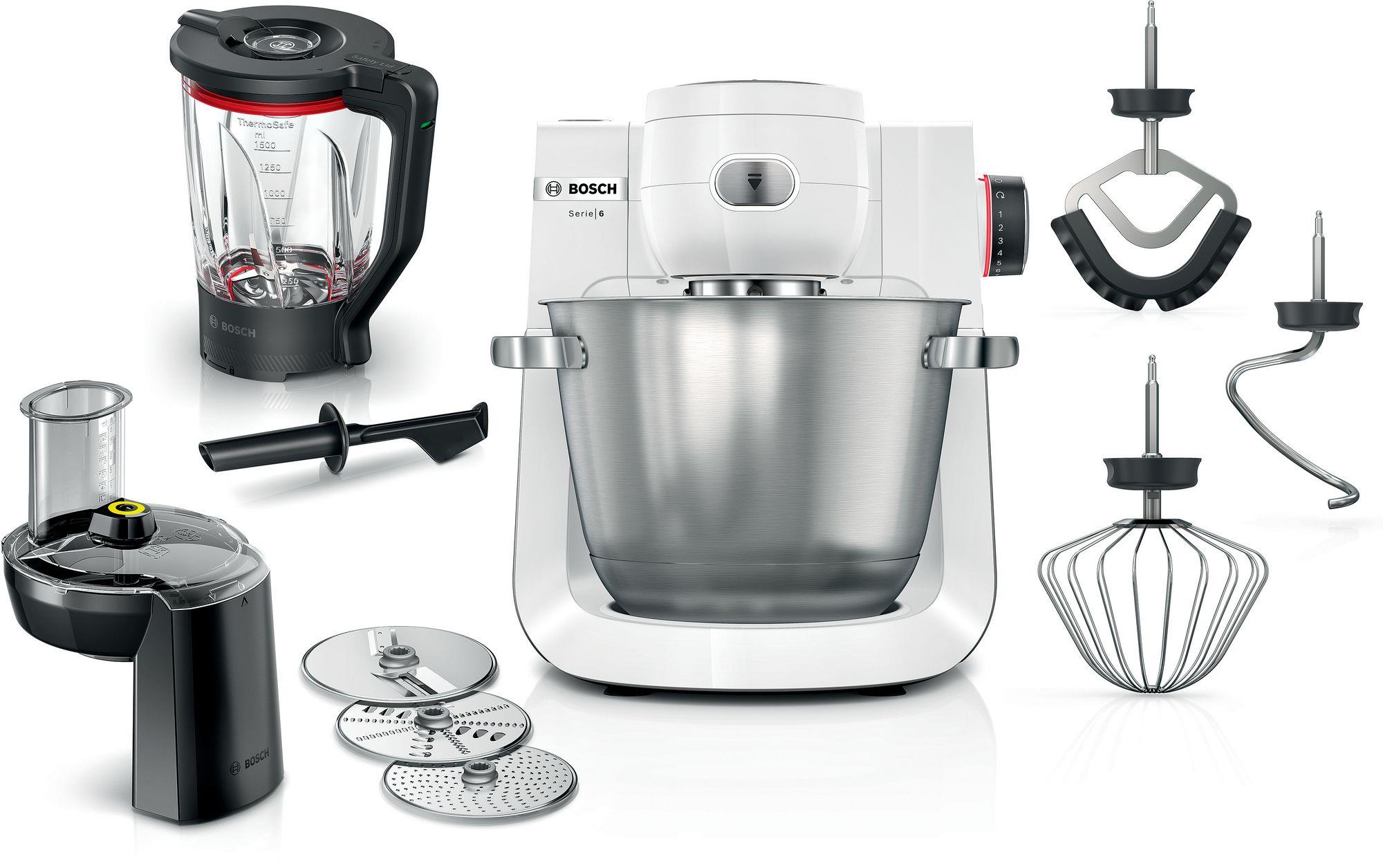 Kuchynský robot Bosch Séria 6 – multifunkčný, planetárne hnetenie, príkon 1600 W, plastové vnútorné prevody, plastový plášť, materiál misy nerez, objem misy 5,5 l, 7 rýchlostí, tlačidlo PULSE, so svetelnou signalizáciou, vrátane stabilizátora otáčok, s bezpečnostnou poistkou, s navíjacím káblom, funkcie šľahanie, miesenie, hnetenie, stieranie a mixovanie, súčasťou kotúč na strúhanie, kotúč na krájanie, šľahacia metlička (balónová metlička), hnetací hák, miešacia metlička (stierková metlička), misa, veko a sklenený mixér, hlučnosť 76 dB, dĺžka kábla 6,6 m, hmotnosť 11,7 kg, rozmery 33 × 32 × 38 cm (V׊×H), biela a strieborná farba Select brand: Kuchynské roboty BOSCH/kuchynské-roboty-bosch/18868569.htmNie je vyplnený Alternatívny text k fotografii!Kuchynský robot BOSCH MUMS6EW22 MUM Séria 6Baví vás pečenie a varenie? Uľahčite s