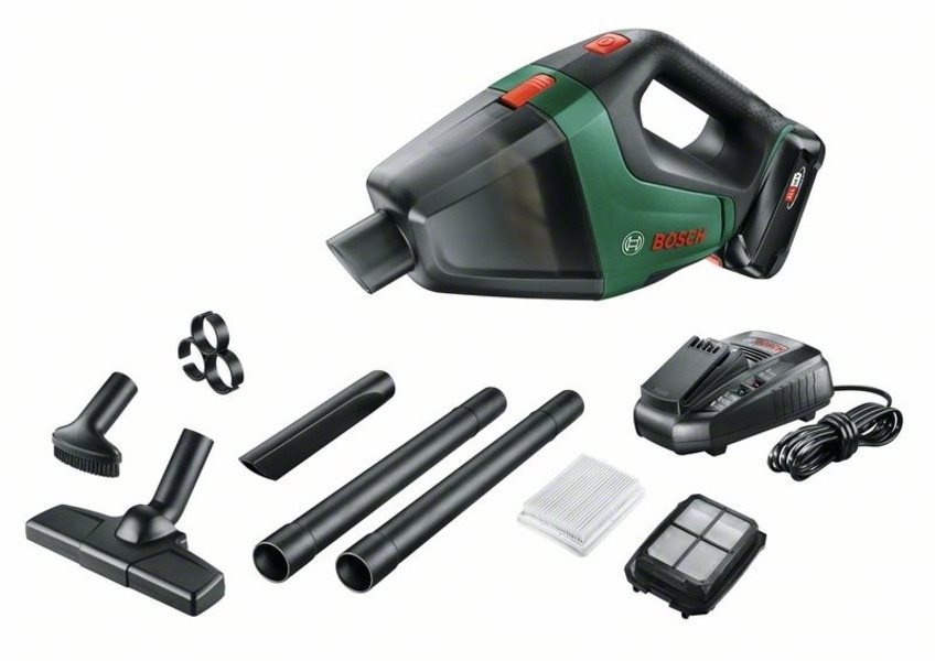 Ručný vysávač – aku, na všetky druhy podláh, na vysávanie, na batérie Li-Ion, doba chodu 20 min, plastová zberná nádoba, ovládanie na tele, autovysávač, s predlžovacou trubicou, rozmery 16 × 21 × 44 cm (V׊×H), hmotnosť 1,3 kg, zelená a čierna farba S ručným vysávačom Bosch UniversalVac 18 zvládnete všetko – od upratovania podláh až po vysávanie prachu zo zásuviek. Vďaka silnému výkonu odstráni aj ťažšie materiály. Ručný vysávač Bosch UniversalVa