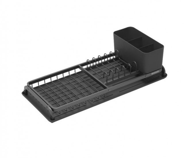 Odkvapkávač na riad – oceľová konštrukcia, materiál podložky plast, držiak na príbory a odnímateľná odkvapkávacia podložka, čierna farba, rozmery 12,6 × 20 × 46,3 cm (V׊×D) Praktický odkvapkávač na riad Brabantia 117268 urobí radosť všetkým…