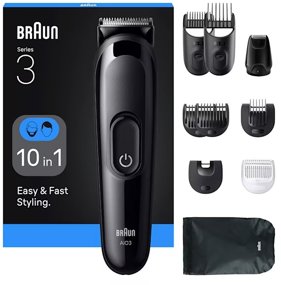 Zastrihávač – na hrudník, vlasy, chrbát, fúzy, intímne partie, podpazušie a nohy, pánsky, protišmyková rukoväť a nastaviteľná dĺžka strihu, 9 nadstavcov, materiál čepelí oceľ, min. dĺžka strihu 0,5 mm, max. dĺžka strihu 21 mm, na akumulátor, ovládanie pomocou tlačidiel Zastrihávač Braun Series 3 AIO3560 10 v 1Túžite po precízne upravených vlasoch a fúzoch ako z kaderníckeho salónu? Potom je tu zastrihávačBraun Series 3 AIO3560 10 v 1. Strojček disponuje ostrými oce