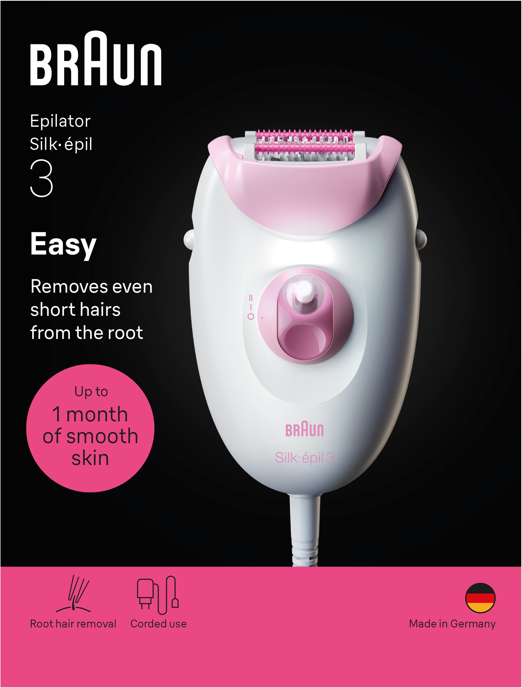 Epilátor – klasický, na intímne partie a telo, dámsky, epilácia namokro, elektrické napájanie, 1 nadstavec, 1 hlavica, štetček na čistenie súčasťou balenia, ružová farba Epilátor Braun Silk·épil 3 3-000Epilátor Braun Silk·épil 3 3‑000 prináša efektívne odstránenie chĺpkov priamo od korienkov, čo zaistí hladkú pokožku až počas približne jedného mesiaca bez holenia či