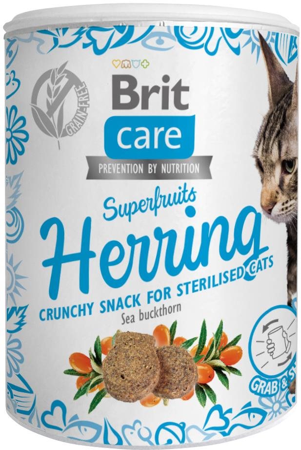 Maškrty pre mačky – výcvikové, pre všetky plemená s normálnou aktivitou, receptúra: sleďová, hrubé bielkoviny 37 %, tuky (živočíšny,kurací a hydinový ) 17 %, bez obilnín Chrumkavá maškrta Brit Care Cat Snack Superfruits Herring je starostlivo vytvorený tak, aby poskytol nielen chutnú odmenu, ale aj cielenú starostlivosť prispôsobenú potrebám kastrovaných mačiek. Je ob