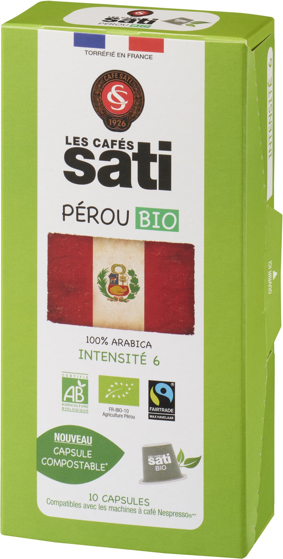 Kávové kapsuly – 100 % arabica, medium (intenzita 6), ovocné tóny, pôvod kávy Peru, kompostovateľné, BIO a fair Trade, veľkosť šálky Espresso a Lungo, materiál kapsuly bioplast, 10 kapsúl v balení Kávové kapsule Café Sati PeruBio, Fairtrade, 10 kapsúlKávové kapsule Café Sati Peru obsahujú 100 % Arabicu pôvodom z Peru. Káva je vyvážená, mäkká a jemná súčasne. ponúka príjemnú chuť s ovocnými a ra
