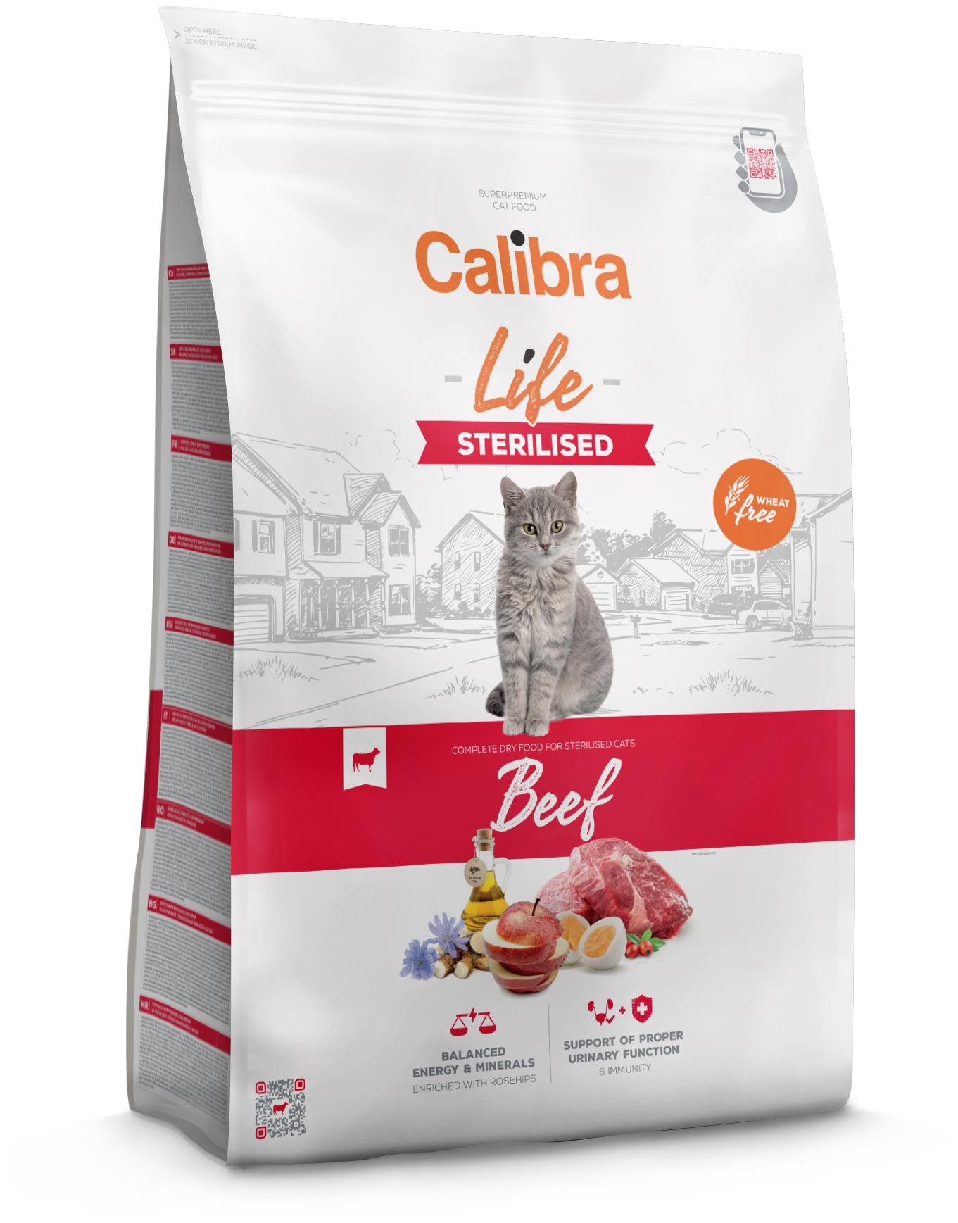 Granule pre mačky – pre malé, veľké a stredné plemená dospelého veku, vhodné pre kastrované zvieratá, hovädzia príchuť, hmotnosť balenia 1,5 kg, suché, hrubé bielkoviny 31 %, tuky (hydinový) 15,5 %, bez obilnín, špecifiká zloženia bez konzervantov, bez GMO, kvasnice a ľanové semienko Calibra Cat Life Sterilised Beef sú kompletné superprémiové granuly určené pre dospelé, kastrované alebo sterilizované mačky. Ide o suché krmivo bez pšenice a bez obilnín, s vysokým obsahom hovädzieho