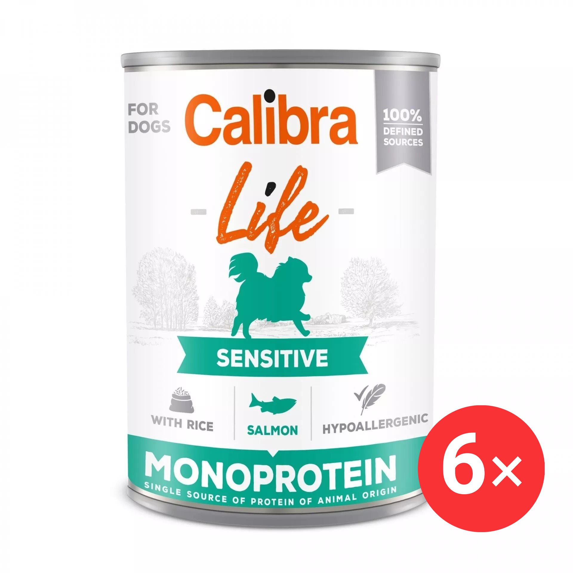 Konzerva pre psov – pre malé, veľké a stredné plemená dospelého veku s normálnou aktivitou, lososová príchuť, hmotnosť balenia 2,4 kg, 6 ks v balení, mokré, hrubé bielkoviny 10 %, tuky 5 %, špecifiká zloženia bez GMO Konzerva Calibra Dog Life Sensitive s lososom a ryžou je kompletným krmivom, ktoré je určené pre dospelých psov a pre citlivé zažívanie. Hypoalergénna receptúra je monoproteínová, je zostavená z limit