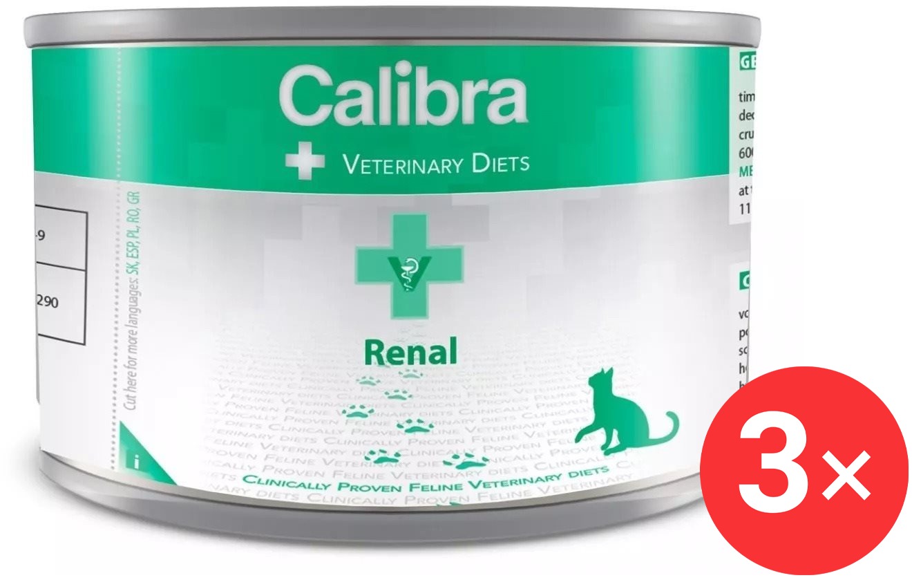 Diétna konzerva pre mačky – pre všetky plemená s normálnou aktivitou, hmotnosť balenia 0,6 kg, receptúra: kuracia, hrubé bielkoviny 6,5 %, tuky (rybí) 8,5 %, špecifiká zloženia: diétne, indikácia: obličky, konzerva, nákupom tohto produktu prehlasujete, že vaše zviera podstúpilo vyšetrenie u veterinára a diétne krmivo mu bolo odporučené na základe stanovenej diagnózy Kompletné diétne krmivo pre mačky. Na podporu obličkovej funkcie v prípade chronickej alebo dočasnej obličkovej nedostatočnosti. Kŕmny návod diétne konzervy pre mačky Calibra VD Cat konz. Renal 3 × 20